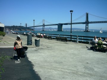 where there was a big food market going on. Having had a bout of insomnia, I sat back for a short nap on a bench, only to have a French woman warn me. “You’re going to get sunburned on your neck!” Turned my bill cap around so that my neck was protected, napped a bit more, then shot a few pix and went on to North Beach, where I grabbed a cappuccino and (in neighboring Chinatown) a melon cake. Went on to Fillmore, where I sat in the Grove Café for a few hours while I wrote and had a cheese plate.